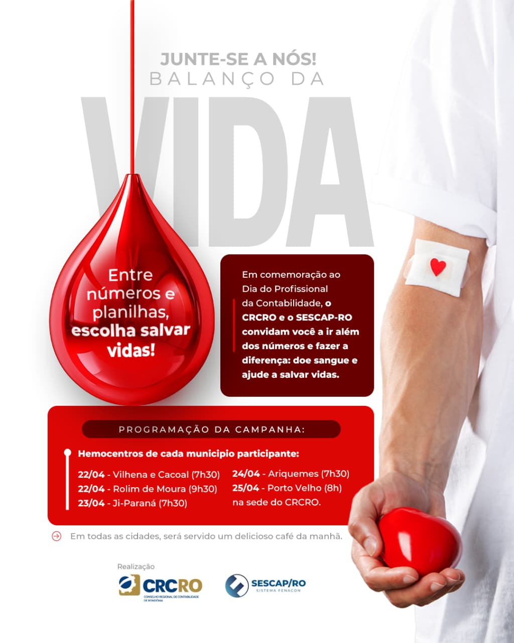 Em celebração ao Dia do Profissional da Contabilidade, o Conselho Regional de Contabilidade de Rondônia (CRCRO) realiza, nos dias 22, 23, 24 e 25 de abril, a campanha “Balanço da Vida”, uma ação solidária que convida profissionais da contabilidade a irem além dos números para salvar vidas por meio da doação de sangue.